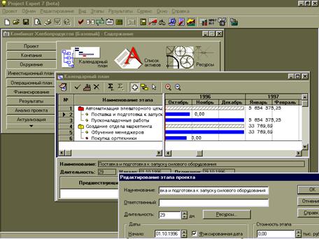 Календарный план – главный модуль раздела (рис.А2). Здесь производится формирование календарного плана, списка активов, составляется описание используемых ресурсов, определяются другие характеристики начальных инвестиций и подготовки производства.