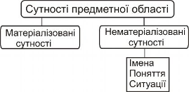 Сукупність реалій (об'єктів) зовнішнього світу - об'єктів, про які можна задавати питання, - утворює об'єктне ядро ПО, яке має онтологічний статус. Не можна одержати в ІС відповідь на питання про те, що їй невідомо. Термін "об'єкт" є первинним поняттям. Синонімами терміна "об'єкт" є "реалія, сутність, річ". Сутність ПО є результатом абстрагування реального об'єкта шляхом виділення й фіксації набору його властивостей. На рис. 1.7 наведений один із підходів до класифікації об'єктів ПО.