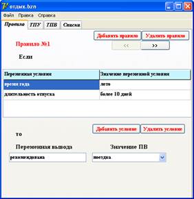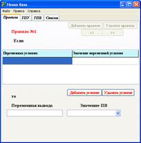 Для добавления переменных условия в правило необходимо нажать кнопку «Добавить условие» или выбрать команду меню «Правка - Добавить условие». Для удаления переменной условия можно нажать кнопку «Удалить условие» или выбрать команду меню «Правка - Удалить условие».