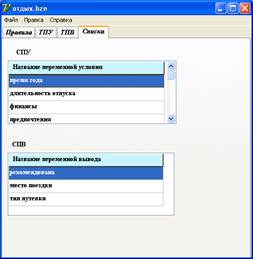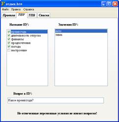Вкладка «ТПУ» предназначена для просмотра таблицы переменных условия (рисунок 3.6). Если к какой-то переменной условия еще не было введено вопроса, то в таблице переменных условия эта переменная не отмечается «галочкой». Чтобы ввести вопрос, необходимо ввести его в поле «Вопрос к ПУ».