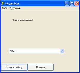 Пользователю будет представлен вопрос и несколько вариантов ответа на него. Необходимо выбрать нужный вариант ответа на вопрос и нажать кнопку «Принять» либо выбрать команду меню «Действия - Следующий вопрос». Если необходимо начать опрос заново, необходимо нажать кнопку «Начать работу» либо выбрать команду меню «Действия - Начать заново».