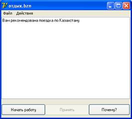 Интерфейс модуля «Klient» предназначен для конечного пользователя. Пользователь отвечает на вопросы, предлагаемые ему экспертной системой. После получения ответов на все вопросы, экспертная система выдает соответствующий результат и рекомендацию, т.е. экспертная система будет работать в режиме консультации.