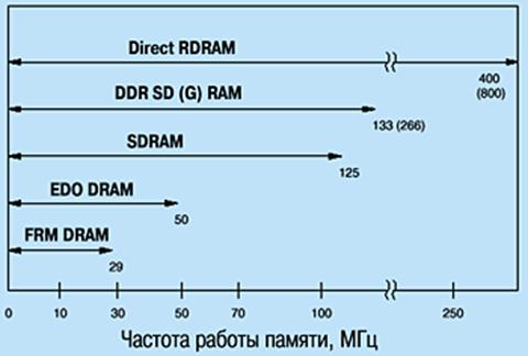 RDRAM представляет спецификацию, созданную Rambus, Inc. Частота работы памяти равна 400 МГц, но за счет использования обеих границ сигнала достигается частота, эквивалентная 800 МГц. Спецификация Rambus сейчас наиболее интересна и перспективна.