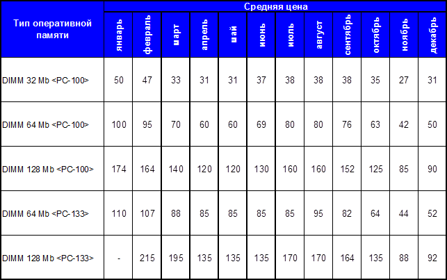Исследование проводилось в городе Владивостоке. В качестве объектов исследования были выбраны модули оперативной памяти, имеющиеся в свободной продаже на рынке. Было определено пять основных типов RAM микросхем (SDRAM DIMM 32 MB <PC-100>, SDRAM DIMM 64 MB <PC-100>, SDRAM DIMM 128 MB <PC-100>, SDRAM DIMM 64 MB <PC-133>, SDRAM DIMM 128 MB <PC-133>), которые на данный момент в набольшей степени соответствовали запросам среднего покупателя (пользователя) По этой причине не брались модули SIMM и более старые чипы (которые уже не производятся и не имеют спроса), а также самые новые разработки – RDRAM, Direct RamBus, так как они поступают на наш рынок в ограниченных количествах, имеют незначительный спрос и потому не дают объективной картины в целом. За основу исследования были взяты прайс-листы компьютерных компаний города (названия в разделе Список использованной литературы). На основе этих данных была составлена следующая таблица.