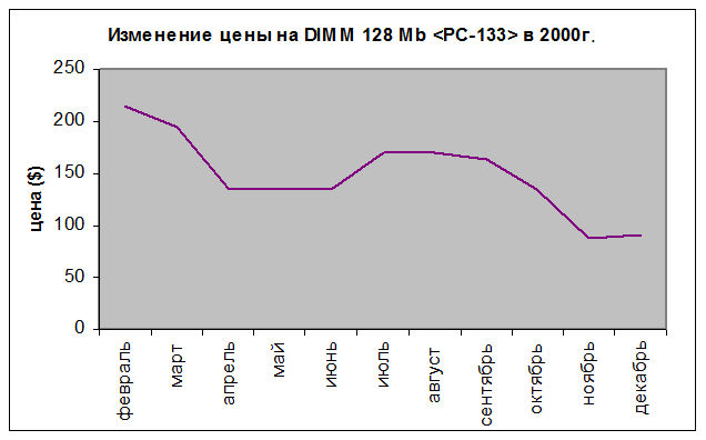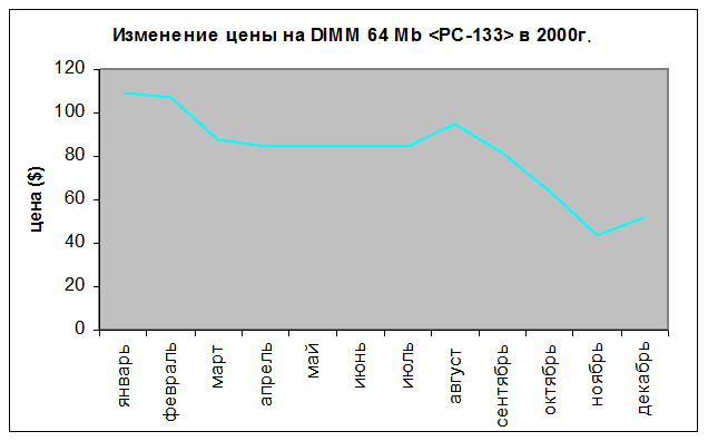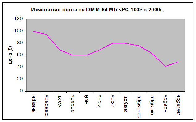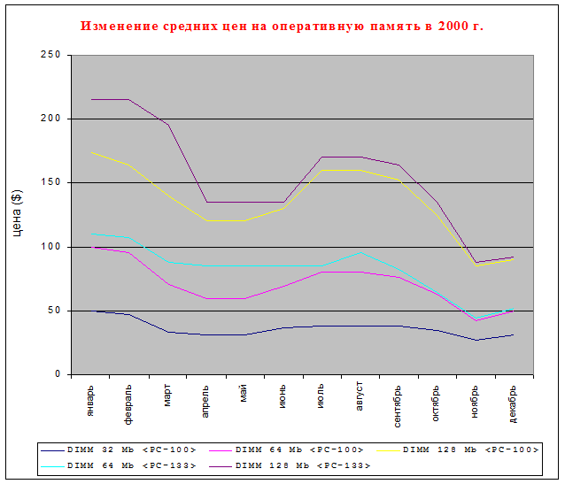 Падение цен на модули оперативной памяти, начавшееся в середине 1999г. продолжилось и в первые месяцы 2000г (кривые на графике убывают с января по апрель). Затем наступает стабилизация (апрель – май). Это связано с предстоящим традиционным летним подорожанием (июнь – август). После цены опять начинают планомерно снижаться в свете общего понижения стоимости компьютерных комплектующих (август – ноябрь), цены падают низко как никогда (до $21 за DIMM 32 MB). Затем опять идет скачок верх (ноябрь – декабрь), и в перспективе цены, на мой взгляд, будут продолжать расти.