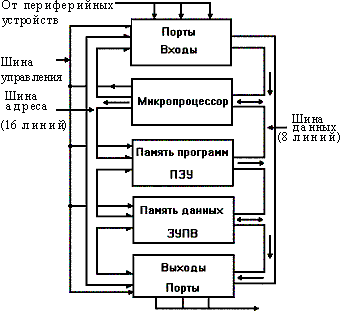 Микропроцессор координирует работу всех устройств цифровой системы с помощью шины управления (ШУ). Помимо ШУ имеется 16-разрядная адресная шина (ША), которая служит для выбора определенной ячейки памяти, порта ввода или порта вывода. По 8-разрядной информационной шине или шине данных (ШД) осуществляется двунаправленная пересылка данных к микропроцессору и от микропроцессора. Важно отметить, что МП может посылать информацию в память микроЭВМ или к одному из портов вывода, а также получать информацию из памяти или от одного из портов ввода.