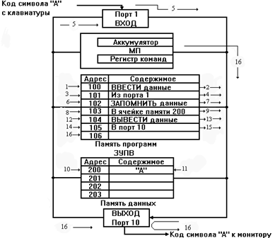Это типичная процедура ввода-запоминания-вывода, рассмотрение которой дает возможность пояснить принципы использования некоторых устройств, входящих в микроЭВМ.