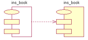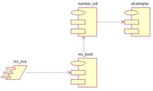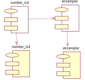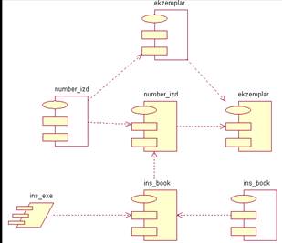 7) Добавление оставшихся зависимостей на диаграмму Компонентов системы: уже существующие зависимости автоматически показаны на диаграмме Компонентов системы после добавления туда соответствующих компонентов. Затем добавила остальные зависимости: на панели инструментов нажала кнопку Dependency (Зависимость). Щелкнула на спецификации пакета ins_book и провела линию зависимости к спецификации пакета number_izd. От спецификации задачи ins_exe к спецификации пакета ins_book.