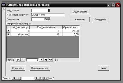 - Ієрархічна форма Відомість для виконання договорів для вводу та модифікації даних в таблиці Дані оплати договорів і Інформація о договорах зображена на рис.8.