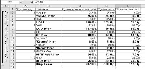 Модифікуємо таблицю, введено формули до комірок стовпця D та підіб’эмо промежні підсумки (рис.18).