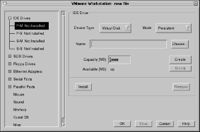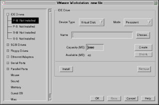 Для створення віртуальної машини (для стислості будемо іноді писати ВМ) простіше скористатися майстром конфігурації, але набагато наочніше цей процес відбувається при використанні "редактора конфігурації" (мал. 18.2), який запускається за допомогою вибору команди Configuration Editor в меню Settings системи VMware. Першим ділом підключимо жорсткий IDE-диск, клацнувши по значку "+" поруч з написом "IDE Devices". Після того, як з'являться 4 додаткових рядки, що відповідають чотирьом каналам контролера жорстких дисків, клацніть по рядку з написом "PM. Not installed". Цей рядок позначає жорсткий диск на першому каналі (Primery Master) і стверджує, що такої не встановлений.