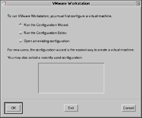 Запускати систему VMware можна двома способами. Перший полягає в тому, що відкривається вікно терміналу, і вводиться команда vmware &. Другий спосіб (в KDE) - в головному меню KDE вибирається команда Запустити програму... (гарячі клавіші - <Alt> + <F2>) і в вікні, що з'явилося вводиться команда vmware. Незалежно від способу запуску ви побачите діалогове вікно вибору конфігурації віртуального комп'ютера, представлене на мал. 18.4.
