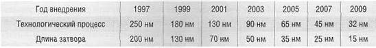 Описанная схема верой и правдой служила на протяжении многих лет, и все усилия электронной промышленности были направлены на то, чтобы уменьшить размеры самого транзистора. Так, в 1965 году в микросхемах интегрировалось всего три десятка транзисторов, а современный процессор IntelPentium 4 насчитывает уже 55 млн. транзисторов на кристалле. Конечно, в процессе эволюции планарных транзисторов менялись не только их размеры. Существенные изменения претерпели и используемые материалы, и даже геометрия самих транзисторов. Ну что ж, все логично. Для того чтобы выдержать диктуемые законом Мура экспоненциальные темпы увеличения числа транзисторов в одной микросхеме, необходимо разрабатывать новые технологии производства. Из ближайших планов корпорации Intel по выпуску процессоров (табл. 1) видно, например, что сегодня в производство внедряется 90-нанометровый технологический процесс изготовления микросхем, при котором длина затвора транзистора составляет 50 нм, а в 2009 году планируется освоить промышленный выпуск транзисторов с длиной затвора уже 15 нм (32-нанометровый технологический процесс). Всего же за последние 5 лет длина затвора транзистора уменьшилась в 4 раза