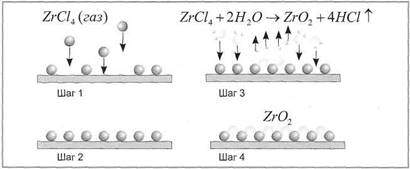 Для получения диоксида стронция первоначально на поверхность кремния осаждают хлорид кремния (ZrCI4 ), после чего под воздействием пара он превращается в диоксид стронция, а побочный продукт реакции (соляная кислота) улетучивается (рисунок 3);