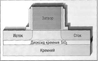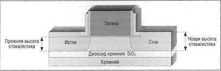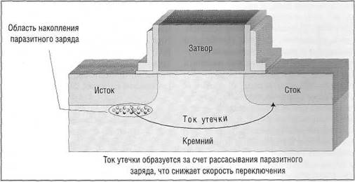 Заряд, накапливаемый n-канальным транзистором в то время, когда он «открыт» (то есть когда на затвор подается положительный потенциал), не может «рассосаться» мгновенно после того, как транзистор запирается. В результате возникает ток утечки, ограничивающий скорость переключения транзистора, поэтому емкость транзистора желательно сделать как можно меньше. Для этого в новом поколении транзисторов применяется структура кремния на изоляторе (silicon on insulator, SOI), при которой (рисунок 5) на кремниевую подложку наносится слой диэлектрика и на нем размещается сам транзистор, то есть легированные области стока и истока, а также область затвора. Паразитный заряд накапливается преимущественно в областях под стоком и затвором, поэтому, чтобы исключить накопление этого заряда, необходимо разместить диэлектрик непосредственно под стоком и истоком. Вследствие этого сокращается толщина транзистора и уменьшается его емкость.