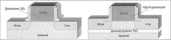 В качестве диэлектрического слоя традиционно используется диоксид кремния (SiO2 ), диэлектрическая проницаемость которого составляет 3,9. Однако уменьшение толщины слоя диэлектрика, которое приводит к возрастанию емкости затвора, то есть положительно сказывается на характеристиках транзистора, имеет свои негативные последствия. Дело в том, что при достижении величины в несколько нанометров начинают сказываться эффекты туннелирования зарядов через слой диэлектрика, что приводит к возникновению токов утечки.