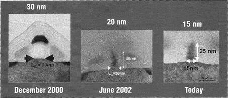 Разработанные технологии терагерцевого транзистора позволяют значительно улучшить характеристики планарных транзисторов и продолжить предсказанное Гордоном Муром сокращение их размеров, но от разработки транзистора до его практического использования в производстве микросхем проходит немало времени. Так, еще в декабре 2000 года корпорация Intel объявила о создании МОП-транзистора с длиной канала 30 нм, в июне 2001 года был создан транзистор с длиной затвора 20 нм, а в декабре того же года уже было объявлено о создании терагерцевого транзистора с длиной канала 15 нм (рисунок 8).