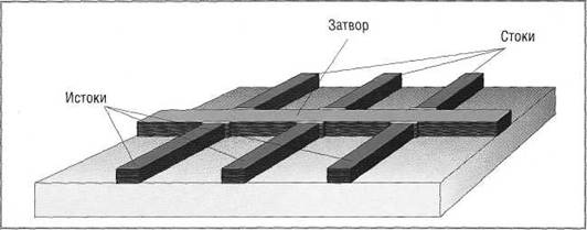 В таких устройствах (рисунок 11) используется один трехмерный затвор, который сразу управляет прохождением тока между несколькими парами истоков и стоков, то есть одновременно образует множество каналов. Такая архитектура в еще большей степени позволяет повысить плотность размещения транзисторов на кристалле и, кроме того, повысить силу тока в транзисторе, поскольку суммарный ток, проходящий через транзистор, пропорционален количеству пар истоков-стоков в транзисторе.