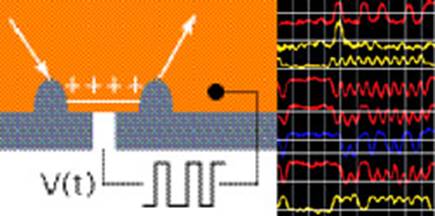 Другим современным бесконтактным методом анализа полупроводниковых структур является Time-Resolved Emission (спектроскопия с временным разрешением). Дело в том, что современные КМОП-структуры являются к тому же и активными оптоэлектронными приборами. Переключающиеся транзисторы излучают вспышки света, хотя этот свет и очень слаб — один инфракрасный фотон испускается примерно за 10 тысяч переключений транзисторов. Тем не менее, подсчет этих фотонов во времени делает возможным получение осциллограмм работы транзисторов, используя полностью пассивный («неагрессивный») режим (Напомним, что в предыдущем случае использовался облучающий лазер, который мог определенным паразитным образом воздействовать на объект исследования). Здесь также возможно достижение пикосекундного разрешения во времени и субмикронного в пространстве, причем для двумерных карт фрагментов микросхем (на экране можно видеть переключающиеся блоки и транзисторы, см. фото). Кроме того, снимаются и своеобразные электрокардиограммы (Электрокардиограммы — медицинское понятие, осциллограммы электрических импульсов животного организма во времени, снятые в разных его точках) сигналов time-resolved emission для отдельных транзисторов.