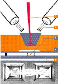 Итак, для проведения «нанохирургии» с обратной стороны кремниевого кристалла (в подложке) ступенчато вытравливаются углубления в форме квадратных обратных пирамид (рисунок 14). Для селективного травления используется сфокусированный ионный пучок и специальный газ-реагент. Точное место травления — прямо «под» нужным элементом — определяется оптическими методами, описанными выше, причем в процессе травления положение ямки постоянно уточняется и корректируется с тем, чтобы на финальной стадии небольшое (диаметром в единицы микрон и даже меньше) углубление попало точно в нужный металлический контакт (с обратной его стороны). После того как ямка «прорыта» до контакта со схемой, в нее «заливается» металл (например, вольфрам) — до образования надежного электрического контакта со схемой. После этого полученные металлические контакты к разным участкам схемы можно соединить между собой в нужной последовательности, осаждая (напыляя) перемычки с тыльной стороны кремниевой пластины (см. фото) — прямо как напайка дополнительных проводков на печатную плату.