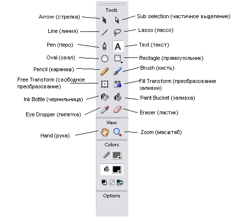На этой панели изображенной на рисунке 1, размещаются инструменты, предназначенные для работы во Flash. Данная панель подразделяется на четыре области: Tools (Инструменты), View (Вид), Colors (Цвета) и Options (Параметры). Некоторые из инструментов имеют модификаторы, отображаемые в области Options при их выборе.
