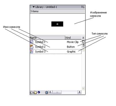 Библиотека, которая изображена на рисунке 3, является местом размещения символов и импортированных элементов фильма. Библиотека представляет собой список содержимого, где перед каждым элементом размещена пиктограмма, указывающая на его тип. Элементы можно группировать в папки, каждую из которых можно разворачивать отдельно, что позволит минимизировать прокрутку экрана при просмотре содержимого библиотеки. Как и в случае слоев, количество элементов библиотеки быстро увеличивается по мере разработки проекта, и если их не систематизировать, наступит полная неразбериха.