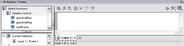 В версии MX объекты интегрированы более тесно. Теперь кнопки представляют собой истинные объекты, свойствами которых можно управлять посредством ActionScript, а видеоклипы могут получать события кнопок. Панель Actions изображена на рисунке 4.