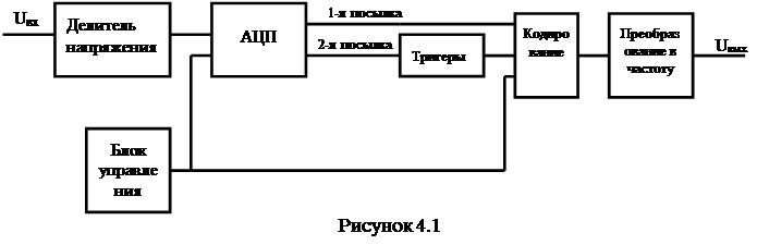 Измеряемое напряжение поступает на вход делителя напряжения, предназначенного для согласования уровня входного сигнала с входом АЦП. Преобразованное напряжение поступает на АЦП, с выхода которого часть двоичного кода, соответствующая первой посылке, сразу же подаётся на блок кодирования (блок логических устройств), а остальная часть – на триггеры, выступающие в роли регистра. Блок регистров предназначен для хранения двоичного кода в то время, когда выходы АЦП находятся в Z – состоянии, что позволяет осуществлять беспрерывную передачу. С выхода блока регистров двоичный код поступает на логический блок (блок кодирования), где происходит преобразование двоичного кода в неприводимый сменно-посылочный код. Сигналы с выхода логического блока поступают на блок преобразования в частоту логических сигналов, где находятся генераторы частоты, ключи включения генераторов, полосовые фильтры и сумматор. Колебания с выходов полосовых фильтров поступают на сумматор, с выхода которого в линию поступает выходной сигнал. Работой вышеперечисленных блоков управляет блок управления, который должен производить следующие операции: