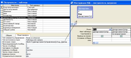 Создаем форму с помощью мастера, из таблицы департамент \ управление добавляем в выбранные поля, поле «департамент \ управление». Далее из таблицы получатели добавляем поля свыше указанной информацией. В результате продолжения мастер предлагает два варианта вывода данных «подчиненная форма » или «связанные формы». Для этого случая воспользуемся первым вариантом, но получившаяся форма не имеет поле со списком для поля департамент \ управление. Для этого открываем форму конструктором и меня поле с значением на поле со списком добавив в неё кнопку печати формы и получаем форму которая при выборе департамента выводить информацию об получателе этого департамента (Рисунок 2.12.).