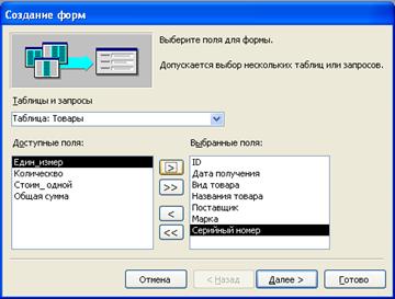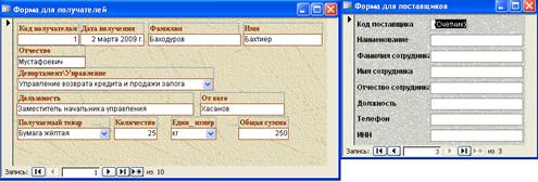 Эта форма тоже будет создана таким же способом, что и предыдущая. Создадим форму с помощью мастера и выберем из таблицы товары поле «наименование», а с таблицы получатели почти все поля. Для демонстрации других возможностей Ms Access выбираем «связанные формы». Получаем форму и так же как и предыдущая форма меняем «поле со значением» на «поле со списком». Мастер автоматически создает форму в виде списка, которая выводить этот список после выбора товара и нажатия на кнопки «получатели». На экране это выглядеть следующим образом (Рисунок 2.13.).