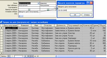 Одним из других требований било вывод на экран только нужный товар, нужного получателя. Для этого создаем простой запрос и ставим условия снизу этого поля с помощью квадратных скобок - [ ] – ставим условия, при выполнении которого выводится таблица с данными, а при неправильном заполнении пустую таблицу. Эти запросы могут бить по различным принципам: по фамилии, то дате получения, по названию товара и т.п. К примеру возьмем запрос по дате получения. Создаем простой запрос и ставим условия на поле «дата получения». После правильного набора даты программа выведет на экран все товары полученные на эту дату (Рисунок 2.17.)