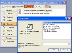 В MS Access можно создавать отчеты различными способами и этот выбор зависеть от того где находится информация которая будет печататься (Рисунок 2.18. ):