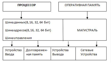 В основу архитектуры современных персональных компьютеров положен магистрально-модульный принцип. Модульный принцип позволяет потребителю самому комплектовать нужную ему конфигурацию компьютера и производить при необходимости ее модернизацию. Модульная организация компьютера опирается на магистральный (шинный) принцип обмена информацией между устройствами. Магистраль включает в себя три многоразрядные шины: шину данных, шину адреса и шину управления.