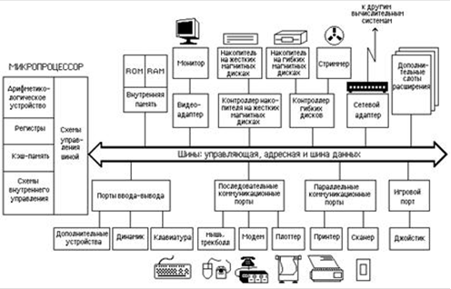 Не блоки, а точнее их порты ввода-вывода, через соответствующие унифицированные разъемы (стыки) подключаются к шине единообразно: Непосредственно или через контроллеры (адаптеры). Управление системной шины осуществляется микропроцессором либо непосредственно, либо, что чаще, через дополнительную микросхему - контроллер шины, формирующий основные сигналы управления.