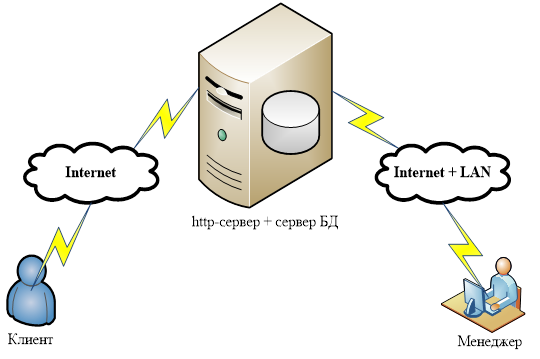 В первом случае требуется канал связи высокой пропускной способности. Во втором случае интерфейс пользователя системы – более упрощенный и менее эргономичный. В остальном, для пользователей порядок работы с системой не различается. Для простоты на схеме взаимодействие клиентов с удаленными офисами компании не отражено; оно – полностью аналогично взаимодействию с главным офисом.