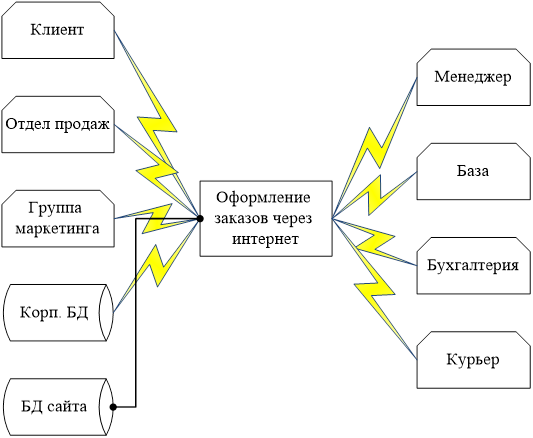 | 0805 | Оформление заказов с розничными покупателями через|из-за|Internet | Оформление и запись в БД заказов через Internet | Реестр заказов покупателей, ВК платёжные поручения для клиентов, прайс-лист | Справочник покупателей, банков, электронных платёжных систем | |