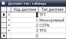 - таблиця "Дисплей тип" містить дані про технологію створення дисплею