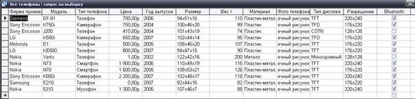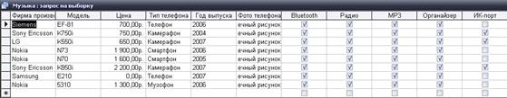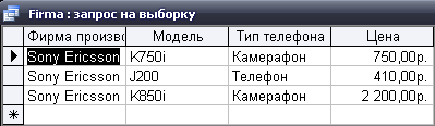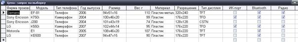 Для пошуку ціни товару, використовувався Багато табличний запит, що вибирає телефон, і відповідно зі зв'язками між таблицями виводить фірму, тип дисплею і т.д. У запиті на вибірку були використані і більш складні умови, Between [Стартова ціна:] And [Кінцева ціна:].