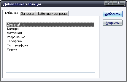 4. У вікні, що з'явилося, "Додавання таблиці"(мал. 4.4.6) виділяємо таблицю і натискаємо кнопку "Додати"(Вданому випадку додаємо таблиці "Телефони", “Тип телефону” і "Фірма”, потім "Закрити".