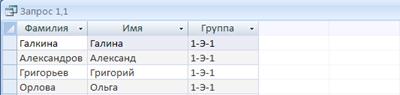 Запрос №1. Используя таблицу Студенты, создать три запроса, по которым из базы данных будут поочередно отобраны фамилии и имена студентов групп 1-Э-1, 1-Э-2, 1-3-3.