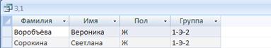 Запрос №3. Используя таблицу Студенты, создать два запроса, по которым из базы данных будут поочередно отобраны фамилии и имена женщин группы 1-Э-2, а затем - мужчин группы 1 -Э-1.