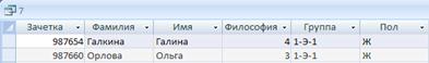 Запрос №7. Используя связанные таблицы, Студенты и Сессия, создать запрос, по которому из базы данных будут отобраны фамилии, имена, номера зачеток и оценки по философии студенток (женщин) группы 1-Э-1.