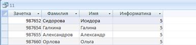 Запрос №11. Используя связанные таблицы Студенты и Сессия, создать запрос по которому из базы данных будут отобраны фамилии, имена, номера зачеток студентов, получивших оценку «отлично» (5) по информатике.