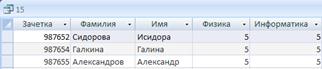 Запрос №15. Используя связанные таблицы, Студенты и Сессия, создать запрос, по которому из базы данных будут отобраны фамилии, имена, номера зачеток студентов, получивших оценку «отлично» (5) одновременно по двум предметам: физике и информатике.