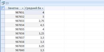 Запрос № 23. Используя, таблицу Сессия, создать запрос с именем Средний балл для расчета среднего балла каждого студента по результатам сдачи четырех экзаменов. Запрос обязательно должен содержать поле Зачетка, которое впоследствии будет использовано для связывания нескольких таблиц.