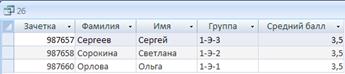 Запрос №26. Используя связанные таблицы, Студенты и Сессия и запрос Средний балл, создать запрос, по которому из базы данных будут отобраны фамилии, имена, номера зачеток, номера групп студентов, имеющих средний балл 3,5.