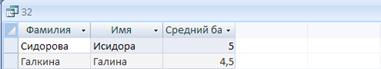 Запрос №32. Используя связанные таблицы, Студенты и Сессия и запрос Средний балл, создать запрос, по которому из базы данных будут отобраны фамилии, имена студентов, имеющих средний балл более 4.