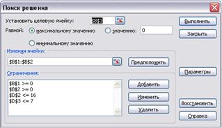 Поиск решения. Процедура поиска решения позволяет найти оптимальное значение формулы содержащейся в ячейке, которая называется целевой. Эта процедура работает с группой ячеек, прямо или косвенно связанных с формулой в целевой ячейке. Чтобы получить по формуле, содержащейся в целевой ячейке, заданный результат, процедура изменяет значения во влияющих ячейках. Чтобы сузить множество значений, используемых в модели, применяются ограничения. Эти ограничения могут ссылаться на другие влияющие ячейки. Пункт поиск решения находится в меню сервис.
