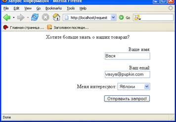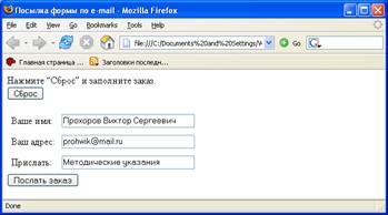 Пользователь нажимает кнопку «Сброс» , и поля принимают значения, установленные по умолчанию. Форма заполняется пользователем, и по нажатию кнопки «Послать заказ» отправляется по адресу myaddres@mail.ru. Обычно браузер не сам отсылает форму, а поручает эту работу почтовой программе, установленной по умолчанию в операционной системе компьютера (например, Outlook). Письмо посылается в виде: