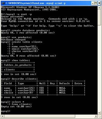 Все этапы создания базы данных с таблицами отражены на экране командной строки: